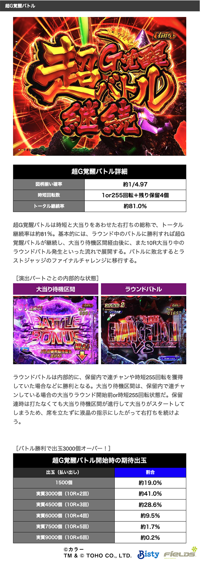 時短と大当りを合わせた総称「超G覚醒バトル」のトータル継続率は約81%と高く、右打ち中の大当りはすべて出玉約1500個(払い出し)。