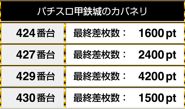 10台設置の『パチスロ甲鉄城のカバネリ』は4台が1000pt以上を記録し、そのうちの1台は4200ptとなった。