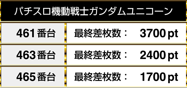 『パチスロ機動戦士ガンダムユニコーン』は6台中3台が1000ptを上回り、3700ptの台もあった。