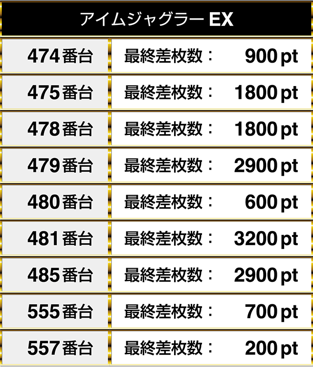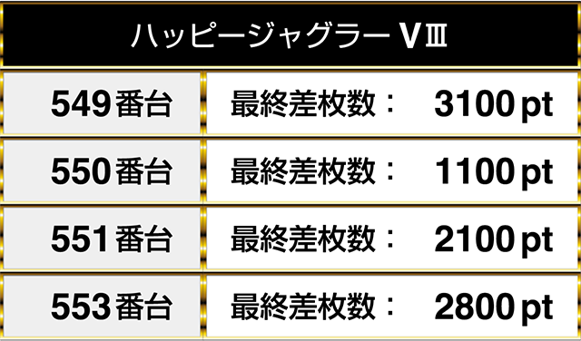 5台が1000pt以上であり、2900ptや3200ptを記録する台もあった。