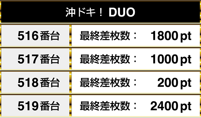 『沖ドキ!DUO』もマイナスptになったのが1台のみで、519番台が2400ptを記録した。