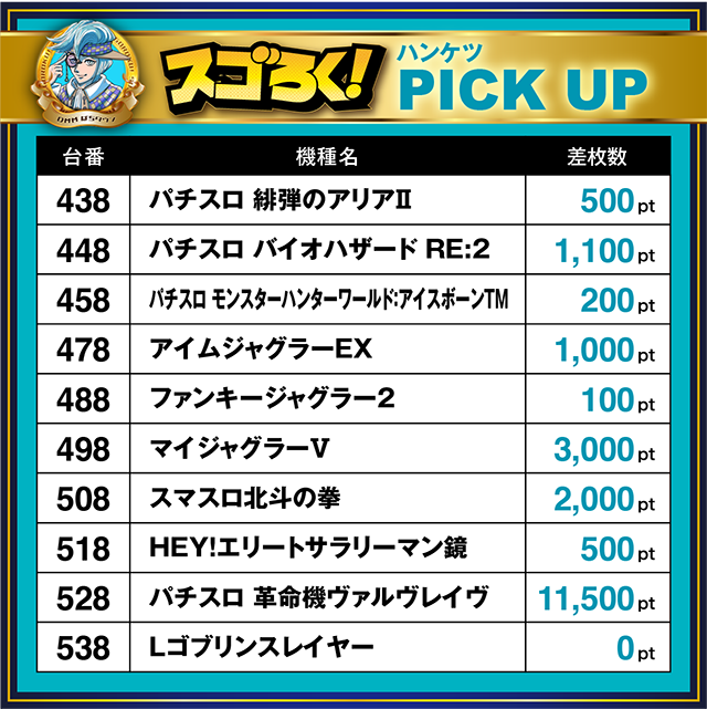 508番台の「スマスロ北斗の拳」は2,000pt、518番台の「HEY!エリートサラリーマン鏡」もプラスと、選んだ台でみんなが活躍してくれたよ。