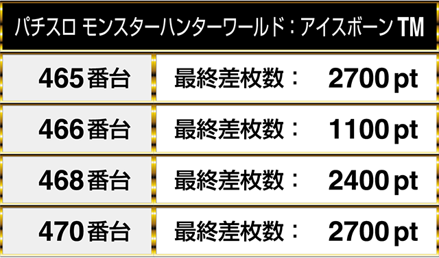 『パチスロ モンスターハンターワールド:アイスボーンTM』は設置されている6台のうち、4台が1000ptを上回った。