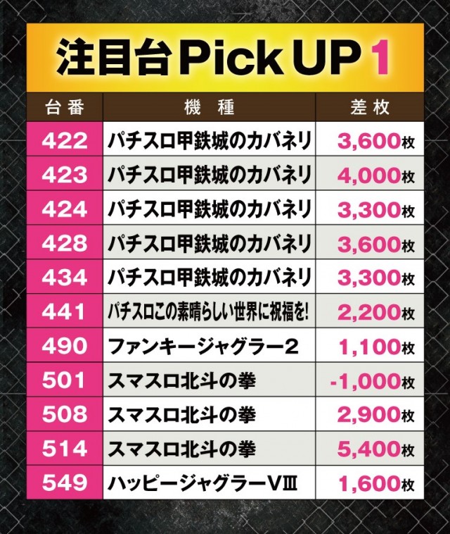 今回は様々場所で好調台が目に付く結果となった。店内で一番盛り上がりを見せていたのが『パチスロ甲鉄城のカバネリ』。対象の5台は全台3,000枚オーバーの大幅プラスとなっている。さらに大人気スマスロの『スマスロ北斗の拳』からも好調台が誕生していた。次回開催時にはこれらを参考に、是非チャンスを掴んで欲しい。