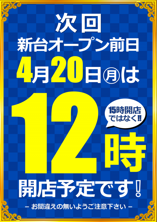 ※新台検査の為、開店時間を変更する場合があります。新台のご案内