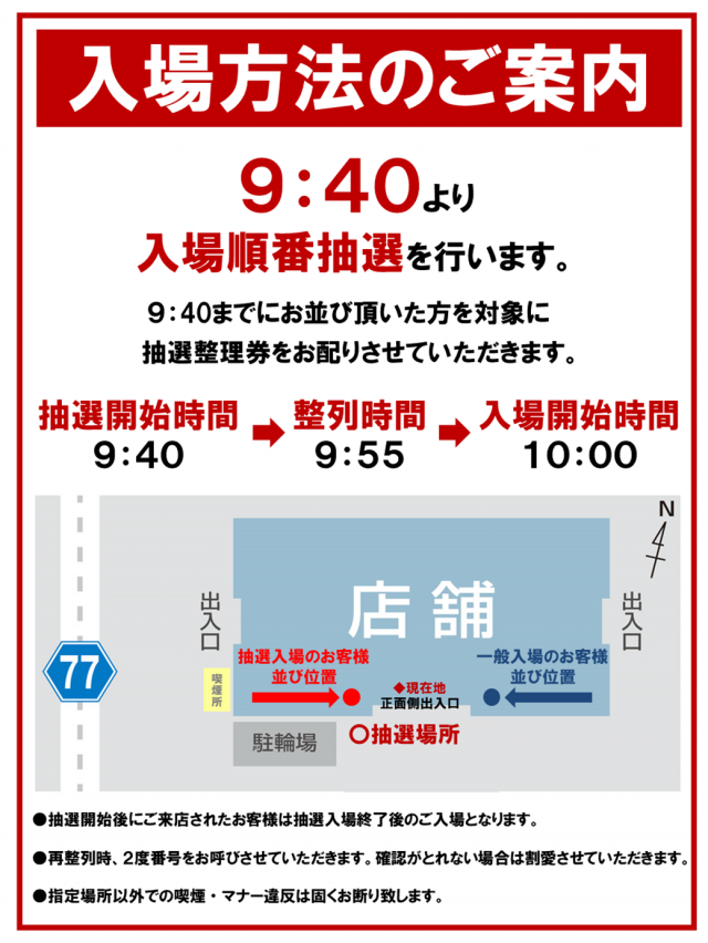 ■ 9:30~9:40 ・正面出入口にて 抽選整理券配布