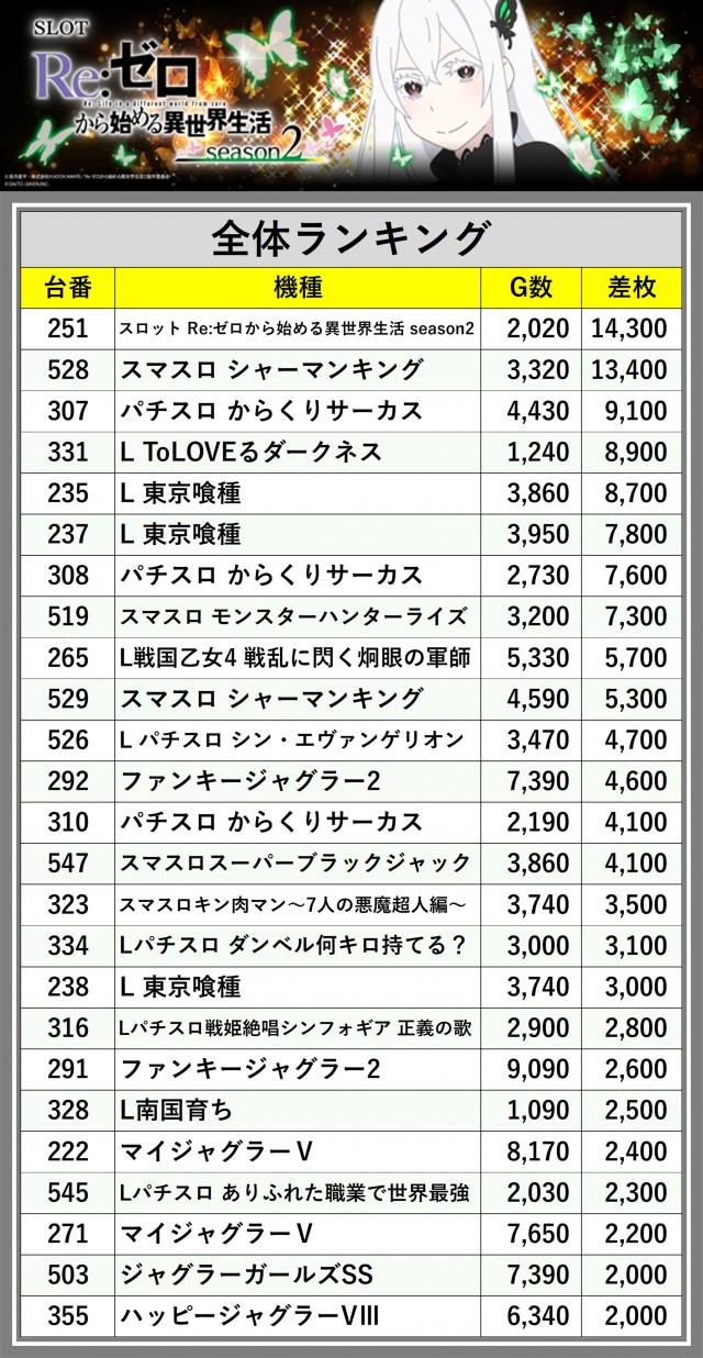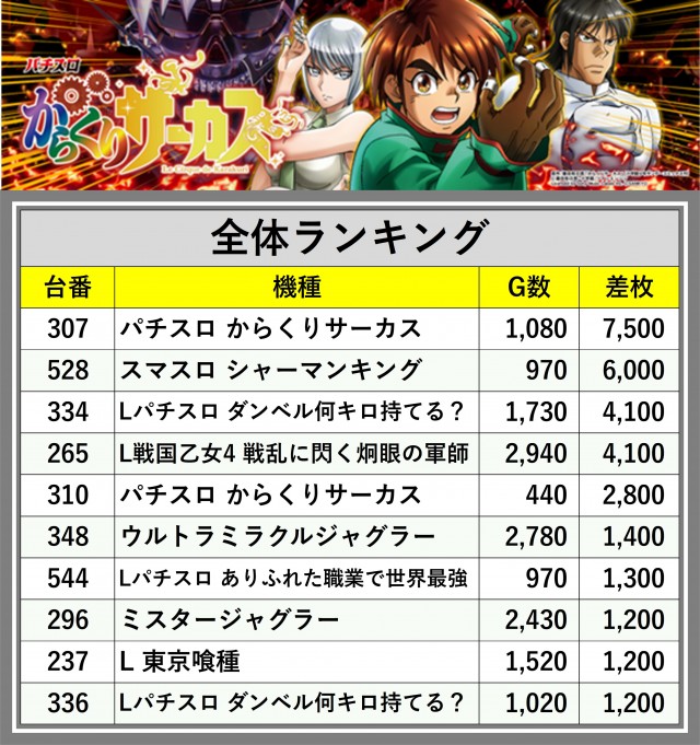 厳選された取材対象機種をはじめ、その他スロット全体から好記録が飛び出した!プレイヤーが楽しんだ1日を下記データにて振り返ってみて欲しい。
