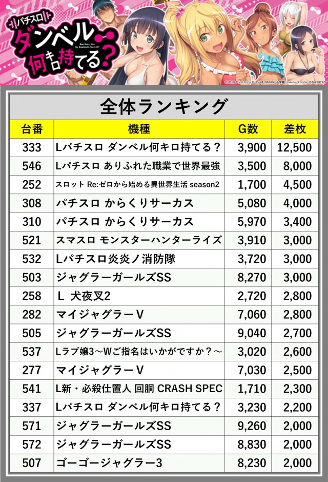 厳選された取材対象機種をはじめ、その他スロット全体から好記録が飛び出した!プレイヤーが楽しんだ1日を下記データにて振り返ってみて欲しい。
