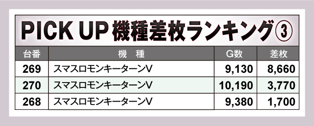 華麗にトップをさらったのは『スマスロモンキーターンV』。269番台が+8,660枚と文句なしの差枚を叩きだした。そして『スマスロキン肉マン~7人の悪魔超人編~』323番台が+8,060枚で、トップに600枚差と非常に惜しい結果となっている。