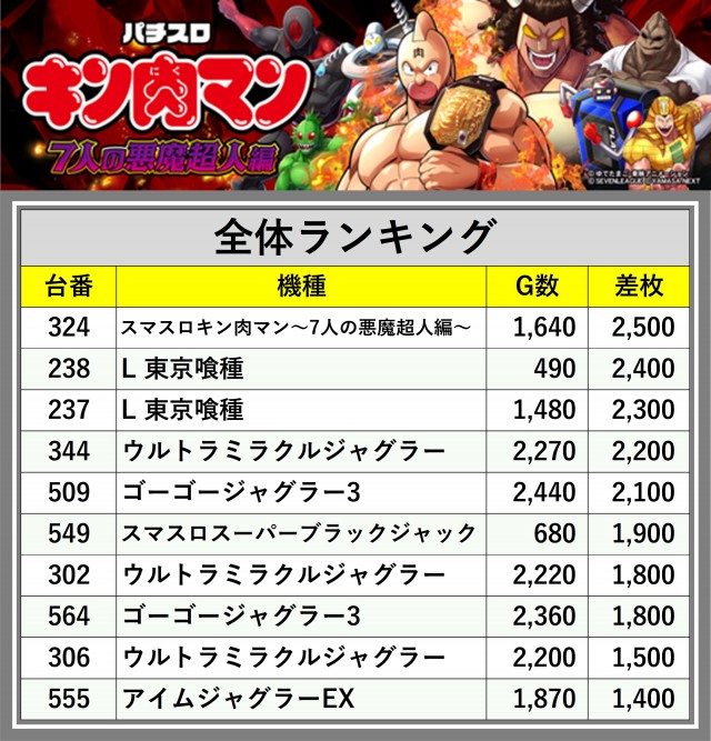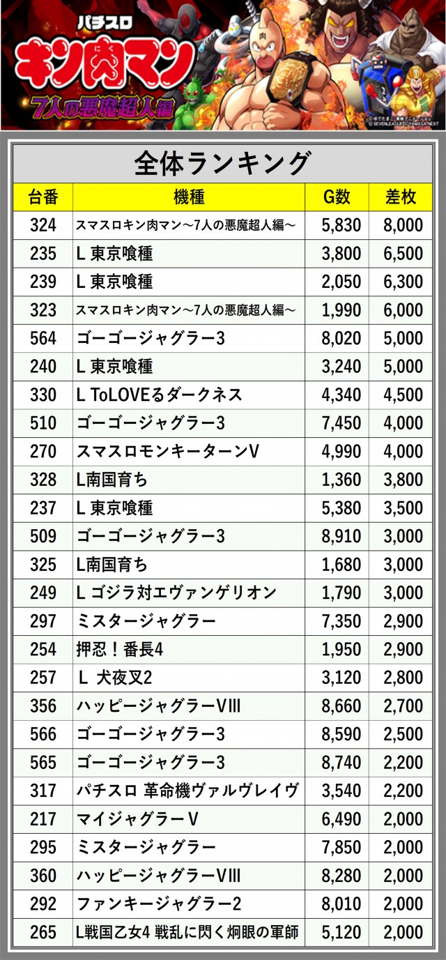 ※差枚数順に掲載しています