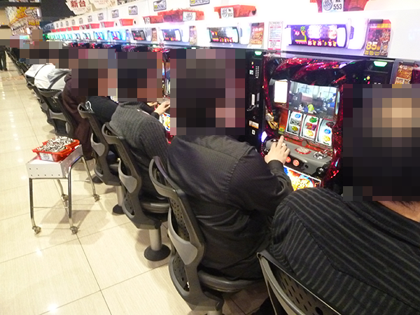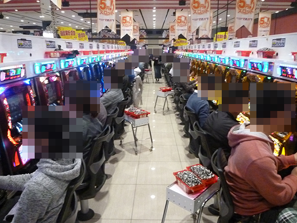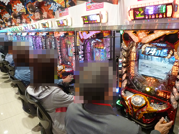 15時ごろの4円パチンコにて、ひときわ人気となっていたのが、新台の「ぱちんこCR北斗の拳7 転生」。プレイヤーたちの明るい表情が、満足度の高さをあらわしているようであった。