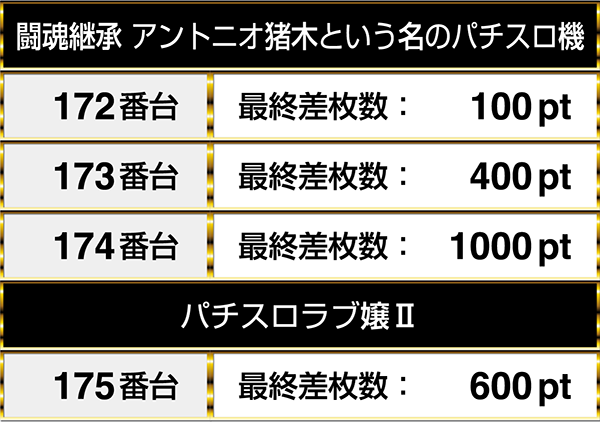 『闘魂継承 アントニオ猪木という名のパチスロ機』の172番台から174番台までの3台が並んでプラスpt!!