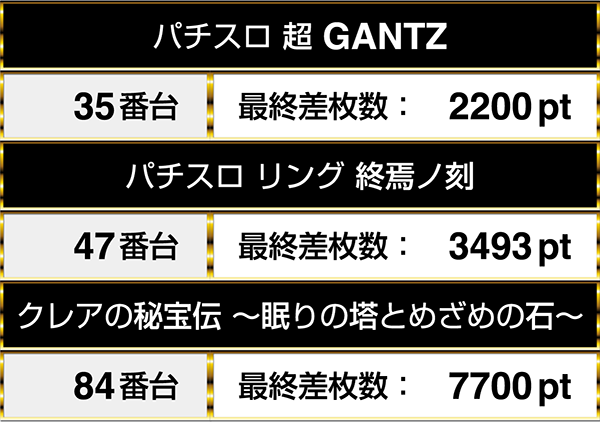 『パチスロ 超 GANTZ』は2000ptを上回り、『パチスロ リング 終焉ノ刻』の47番台は3000ptオーバー!!