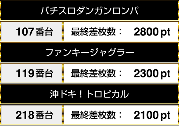 1日を通すと、『ファンキージャグラー』と『沖ドキ!トロピカル』の1台ずつが2000pt以上を記録!