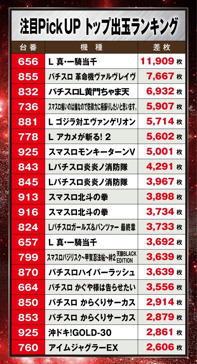 また、その他の機種をチェックすると『パチスロ 革命機ヴァルヴレイヴ』で+7,000枚超、『パチスロL黄門ちゃま天』で+6,000枚超と、定番の人気機種も負けじと店内を盛り上げており、ファンにとっては大満足な一日になったはずだ。