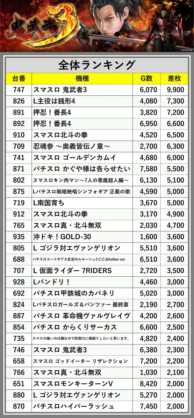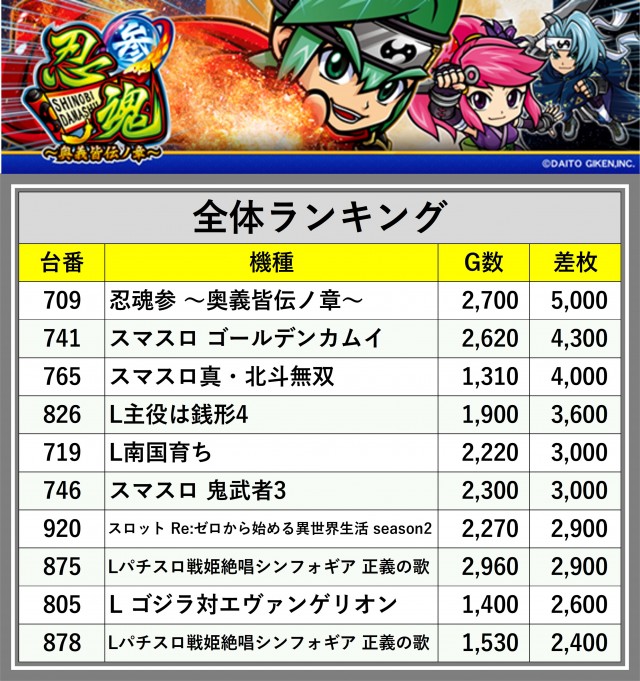 厳選された取材対象機種をはじめ、その他スロット全体から好記録が飛び出した!プレイヤーが楽しんだ1日を下記データにて振り返ってみて欲しい。