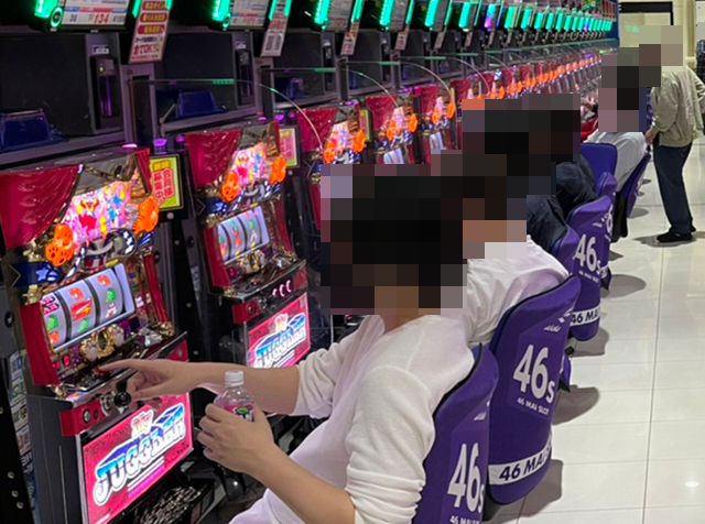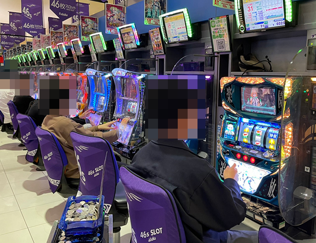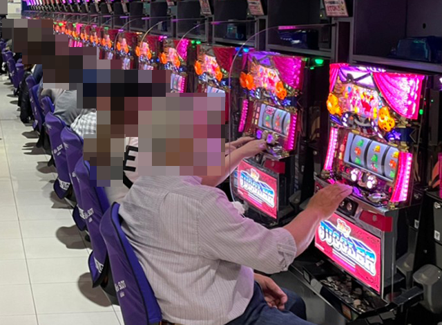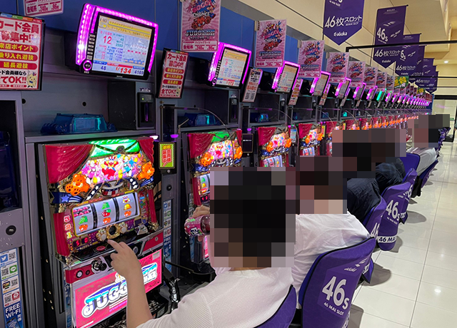 「マイジャグラーV」にも+3,000pt以上の台がならぶ場所があり、ボーナスタイプも盛況となっていた。