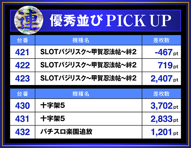「十字架5」の430番台から「パチスロ楽園追放」の432番台までには+1,000pt以上がズラリとならんだ。