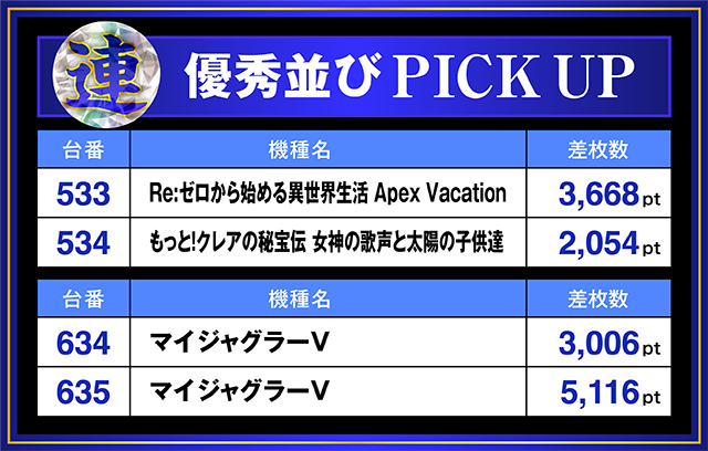 「マイジャグラーV」の634番台は+3,000ptを上回り、635番台は+5,000pt以上を記録!