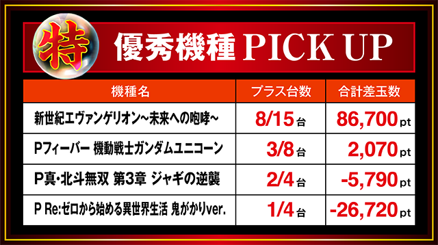 プラスとなった8台のうち6台が+10,000ptを超え、なかには+55,000ptを上回る台もあった。