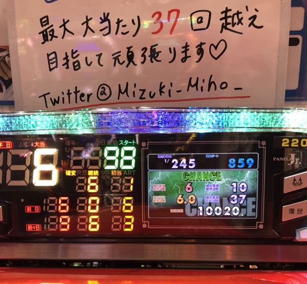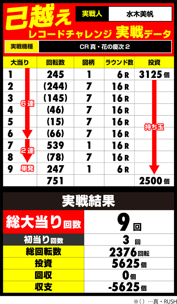 チャレンジ成功に必要な大当り回数は38回と多いものの、1回目の初当りが6連チャンまで伸び、序盤は記録更新に期待ができる展開。