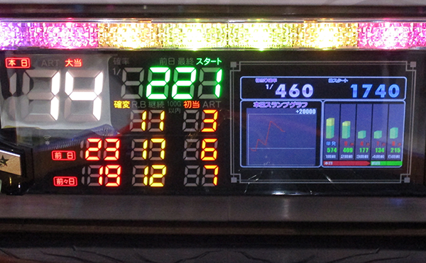 21時前にこの日、最後の初当りを獲得するも単発で終わり、チャレンジは失敗。結局、総大当り回数は目標の半分にしか届かず、不甲斐ない結果となってしまった。