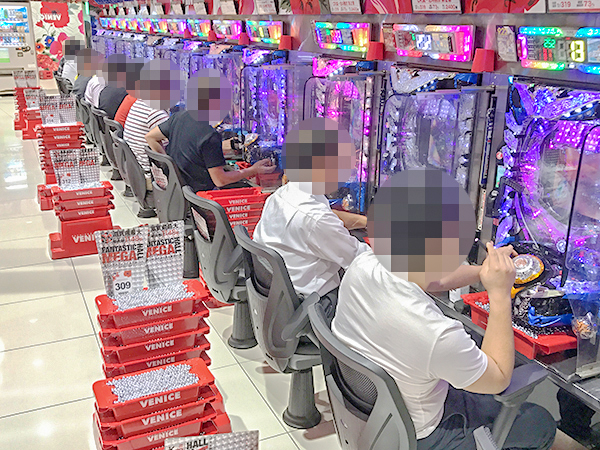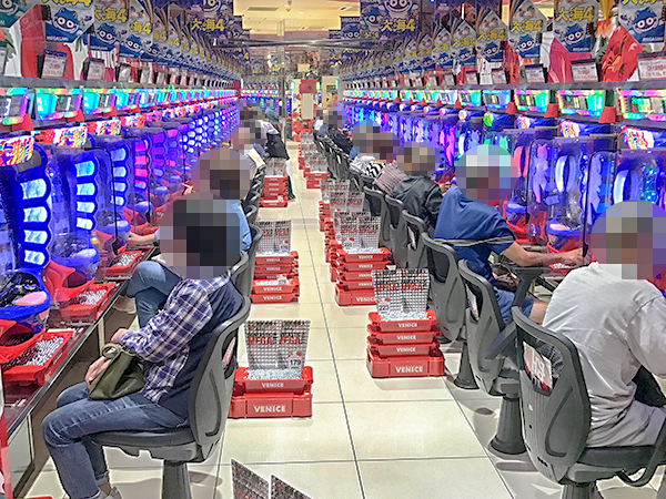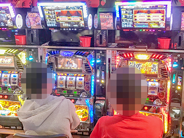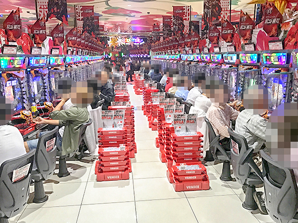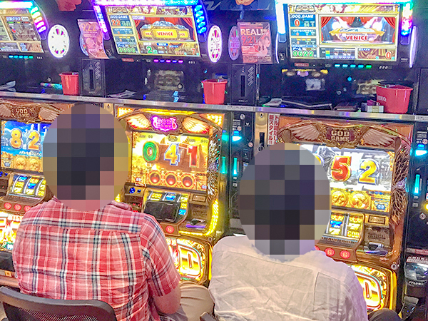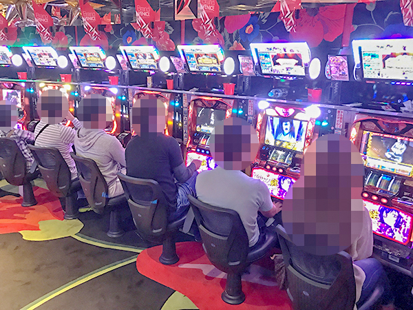 20円パチスロに目を向けると、「バジリスク~甲賀忍法帖~絆」や「ミリオンゴッド-神々の凱旋-」で活躍するプレイヤーが続出しており、シマ全体に華やかな光景が広がっていた。