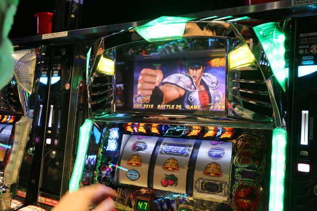 さらに新台の『蒼天の拳』も、ドル箱(液晶表示)がズラリと並ぶフル稼働。