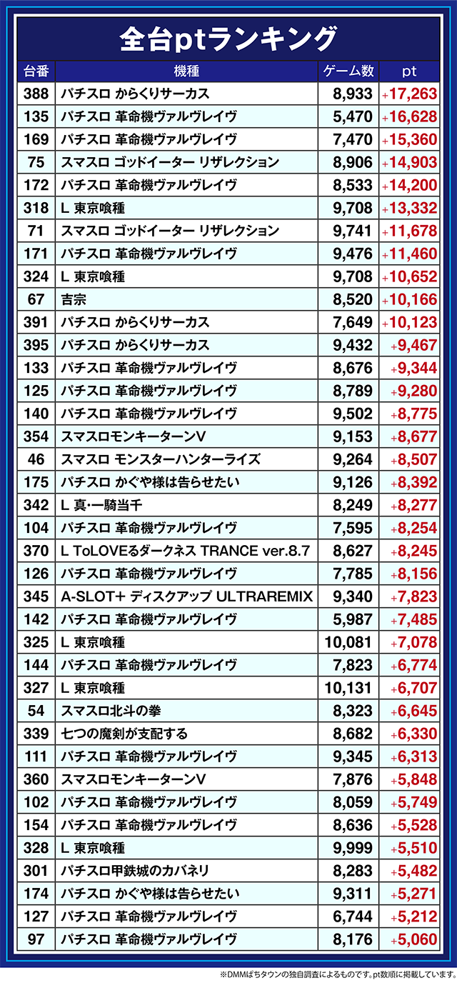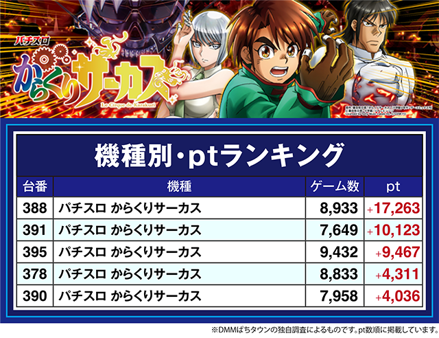 「パチスロ からくりサーカス」も2台が+10,000ptを超え、388番台が+17,000pt以上となった。