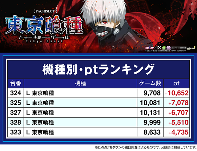 4台が+5,500ptを超えた「L 東京喰種」では、324番台が+10,652pt。