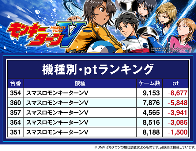 「スマスロモンキーターンV」と「スマスロ北斗の拳」も多くの台が結果を残し、どちらの機種でも+6,000ptを上回った台を確認している。