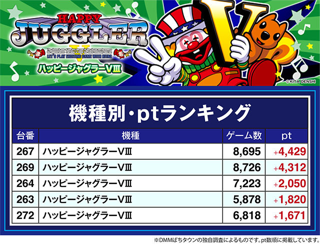 「ハッピージャグラーVⅢ」では、267番台と269番台が+4,300ptオーバー。