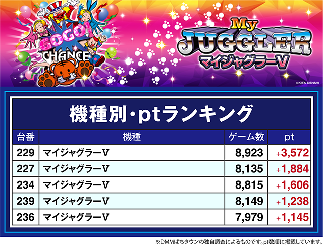 また、「マイジャグラーⅤ」の229番台は+3,572pt、「アイムジャグラーEX」の219番台も+3,182ptを記録。