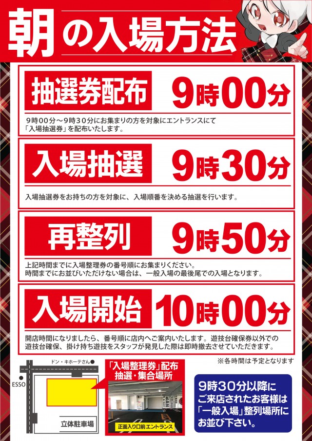 9:10~ 入場抽選券配布 9:30 入場抽選開始 9:55 再整列 *日時によっては抽選時間は変更になる事が御座います。 |