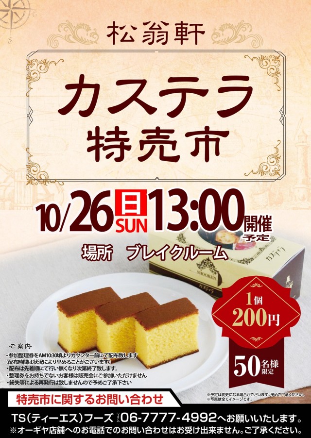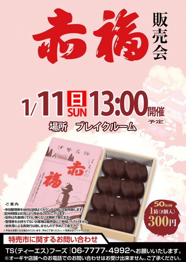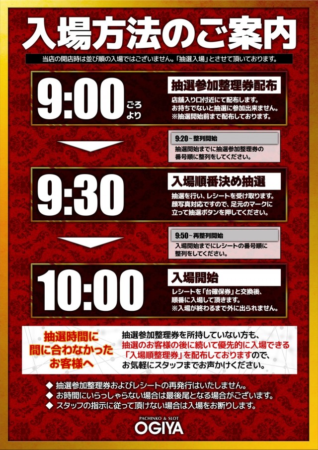 09:00 抽選参加整理券配布 09:30 入場順番決め抽選 09:50 再整列 10:00 入場開始 ※抽選参加整理券配布場所=店舗中央出入り口付近。 |