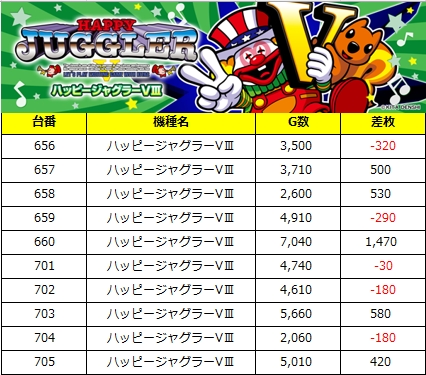 ハッピージャグラーVⅢ勝率:50%(5/10)平均差枚:250枚