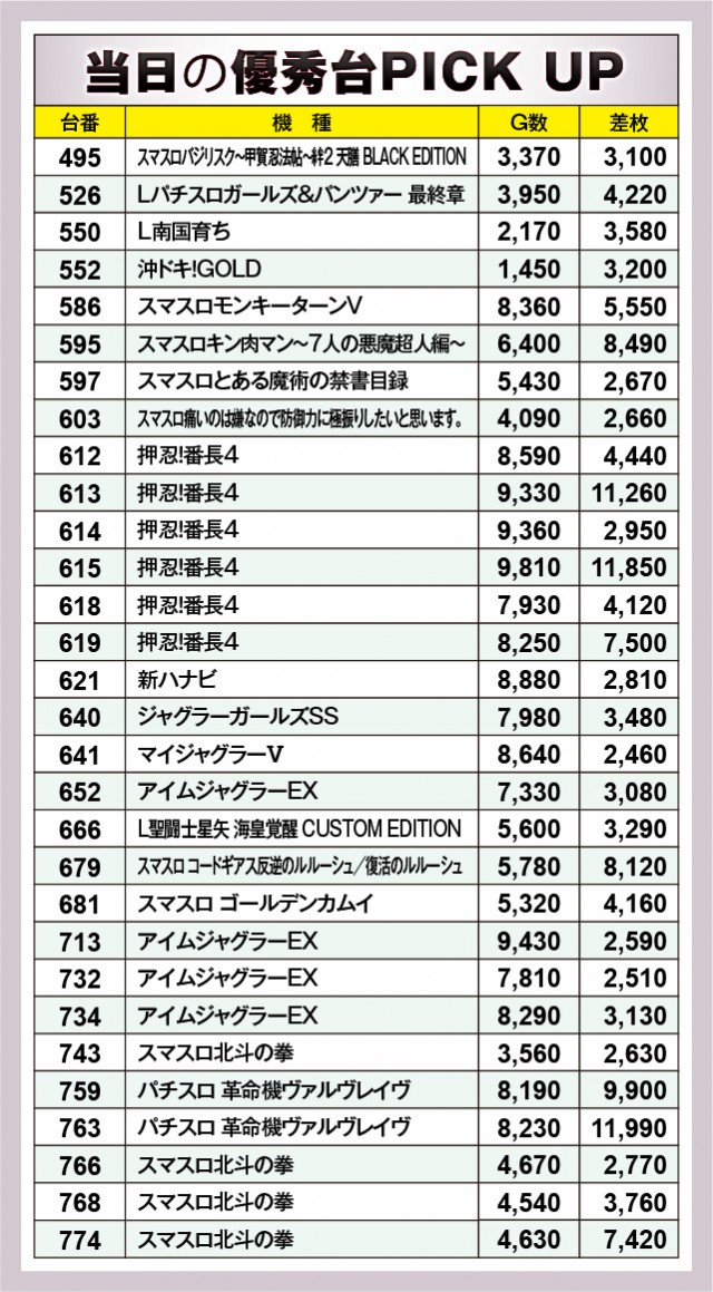 『押忍!番長4』613番台+11,260枚・615番台+11,850枚、さらに『パチスロ 革命機ヴァルヴレイヴ』763番台+11,990枚と、当日は3台の万枚OVERが発生。後者は759番台+9,900枚と万枚未遂も確認でき、これら機種のポテンシャルの高さが窺える。また全体的に回転数が付いており、ファンはレバーを叩くごとに自信を深めていったのではないだろうか。