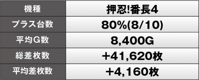 『押忍!番長4』は勝率80%を記録しており、その中で万枚OVERも確認できることから、相当な可能性を秘めていたと言える。また『アイムジャグラーEX』も同様で、こちらは総差枚数+26,150枚と大きな熱量を放っていた。各所でコンスタントなGOGOランプの輝きが見られ、その至高の光はファンを祝福していたと言っても過言ではない。