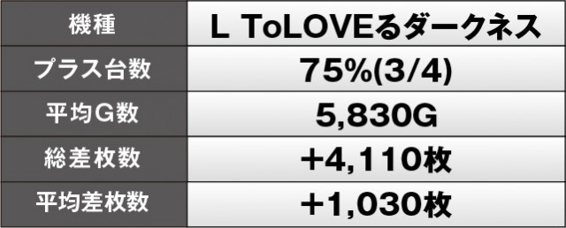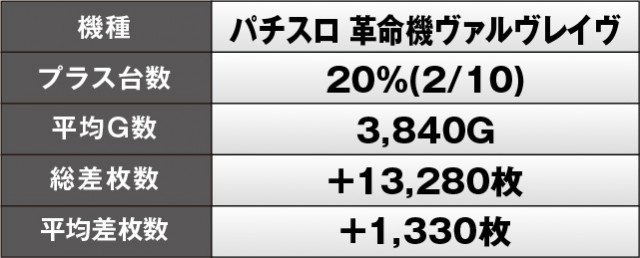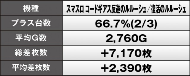 そして『L ToLOVEるダークネス』『スマスロ コードギアス反逆のルルーシュ/復活のルルーシュ』もポテンシャルが高く、半数以上の台がプラス差枚数で終えていた。『パチスロ 革命機ヴァルヴレイヴ』も同じ状況だったが、全体的に波に乗れず勝率が低い結果となっている。とはいえ万枚OVERと万枚未遂台の発生により、総差枚数+13,280枚とインパクトを残したのが鮮烈であるばかりだ。