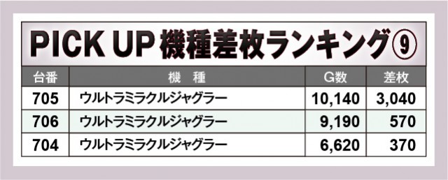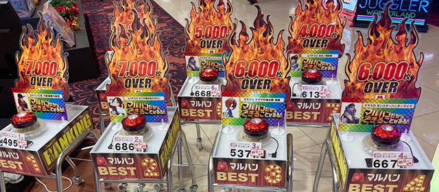 前述したように『L ToLOVEるダークネス』の万枚台が際立っており、『Lルパン三世 大航海者の秘宝』もまた5,000枚OVERでファンの意欲を掻き立てていた。それ以上に目に焼きつくのは『アイムジャグラーEX』『マイジャグラーⅤ』『ウルトラミラクルジャグラー』の活躍で、いずれもじっくりと打ち込まれていた形跡が見て取れる。回転数と差枚数が比例する展開を披露しては、ファンに笑顔をもたらしていたようだ。
