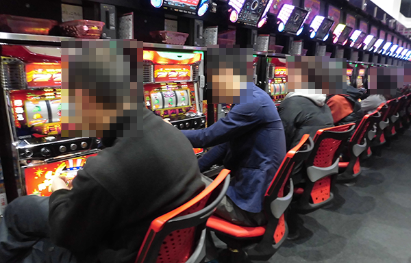 15時を過ぎた頃のパチスロをみると、「ニューアイムジャグラーEX」や「ハナビ」といったボーナスタイプが盛況。華麗なパフォーマンスを披露するプレイヤーが多く、盛り上がりもひときわ大きかった。