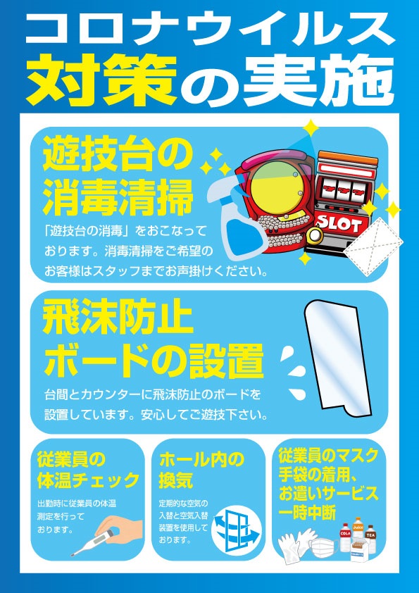 5月15日(金)より営業を再開させていただき連日午前10時オープンしております!なお、ご遊技は【午後10時まで】とさせて頂きます。
