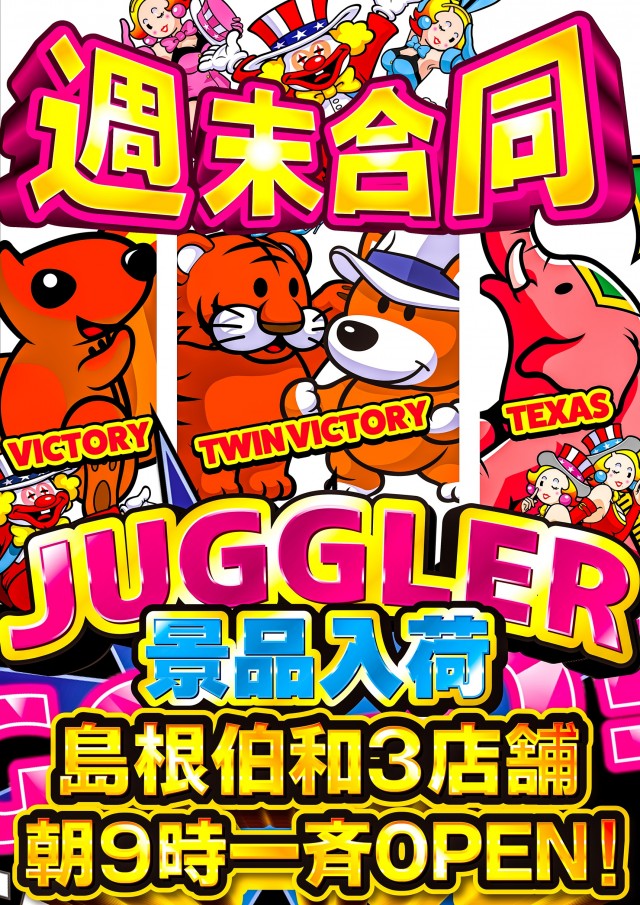 明日島根伯和3店合同JUGGLER景品入荷!全館朝9時開店!