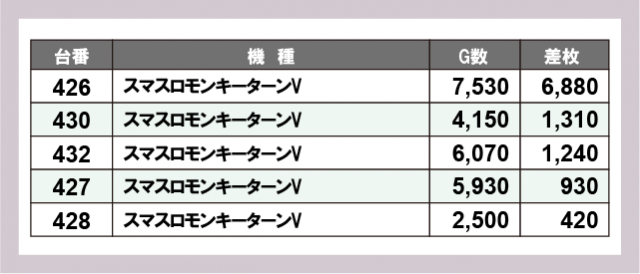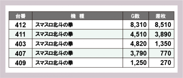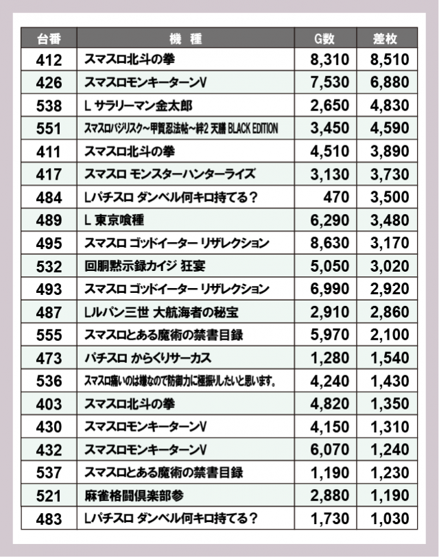 ※差枚数順に掲載しています