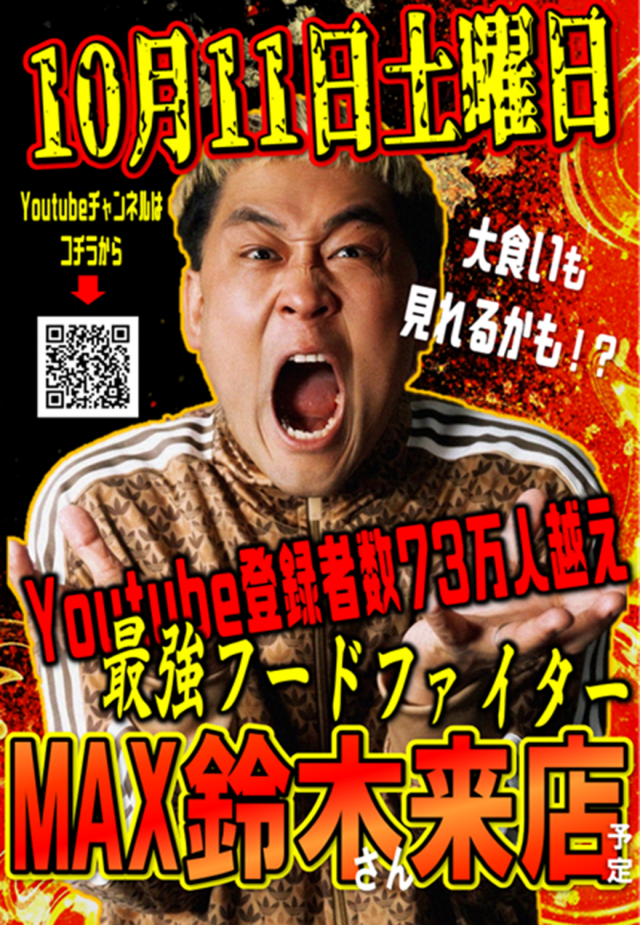 明日、🔥最強フードファイター🔥【MAX鈴木さん】ご来店‼