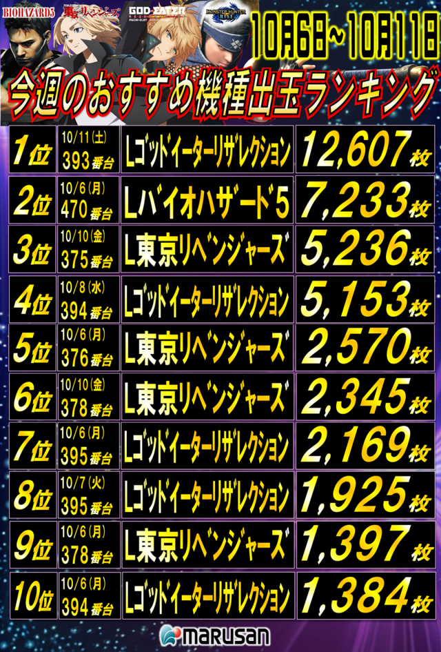 10月前半出玉ランキング‼