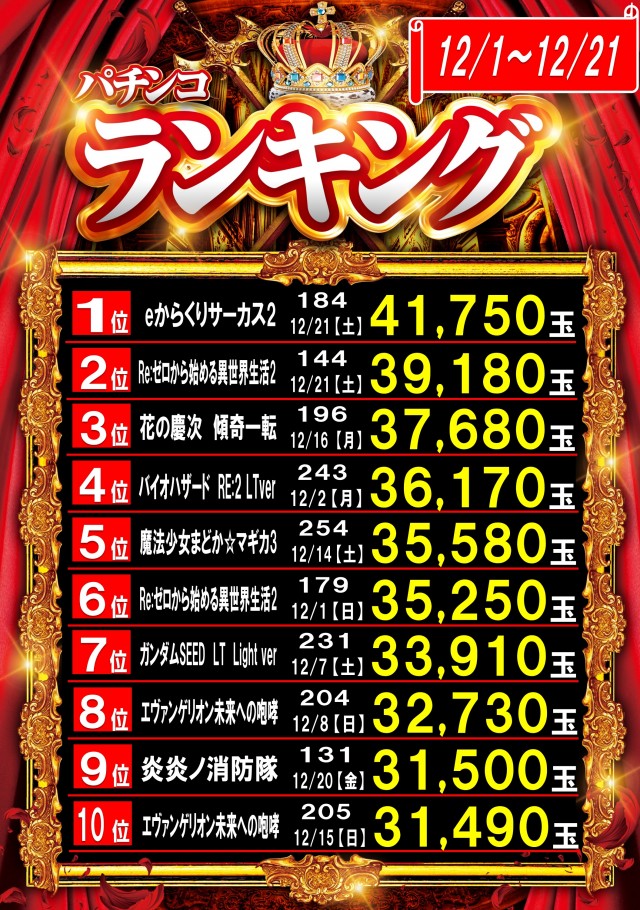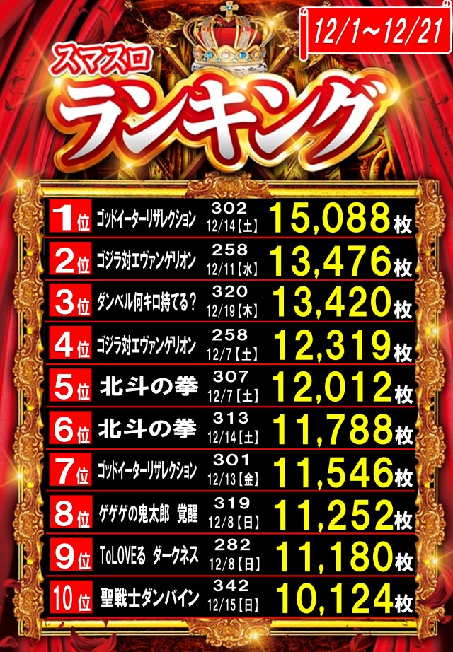 1位 12月7日(日) 2位 12月13日(土) 3位 12月6日(土)