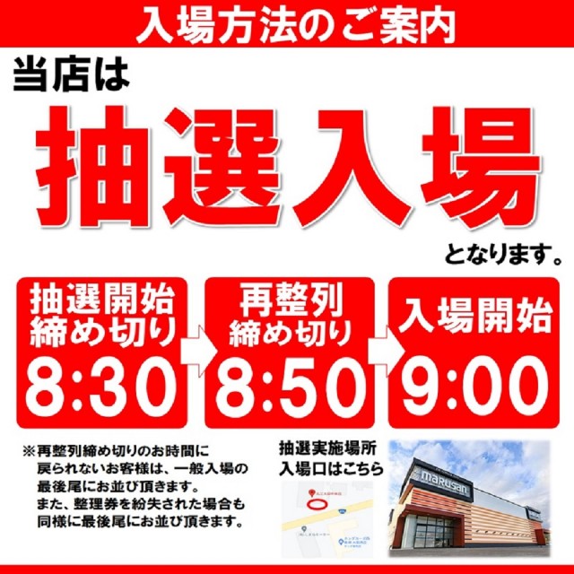 【抽選入場】抽選開始[8:30] 再整列締切[8:50] 入場開始[9:00] |
