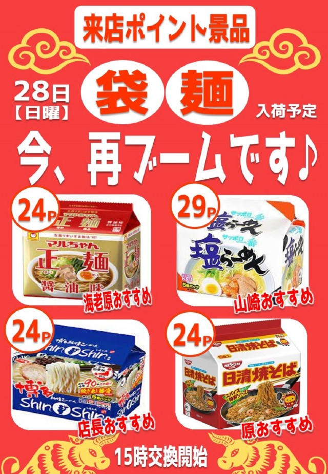 明日来店ポイント『袋麺』入荷予定です♪