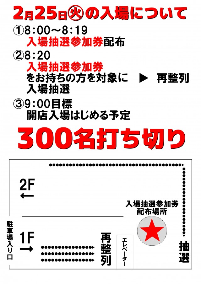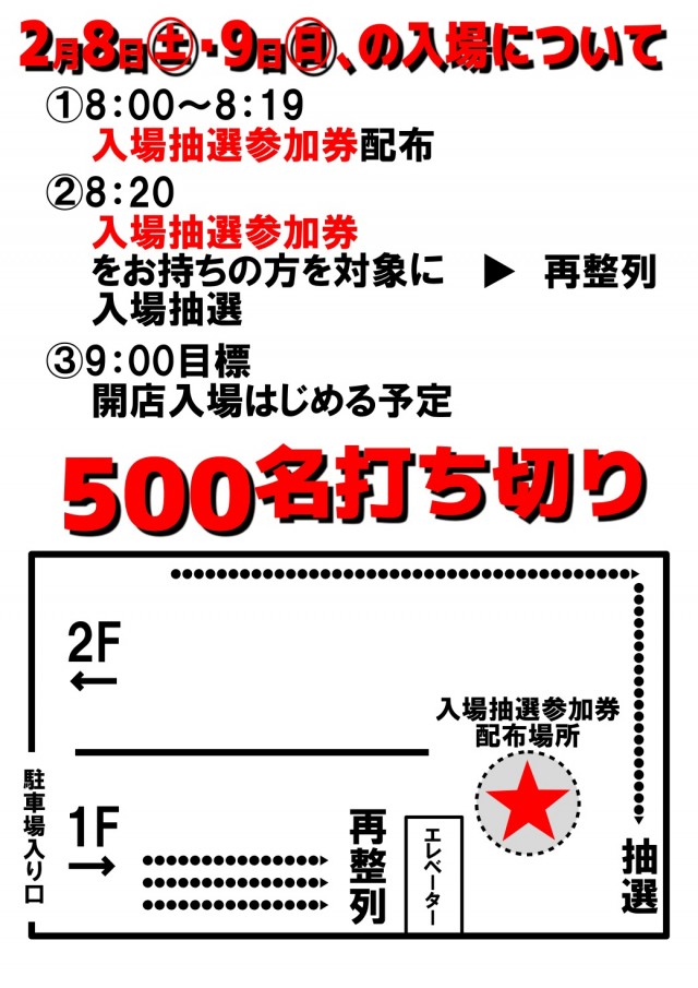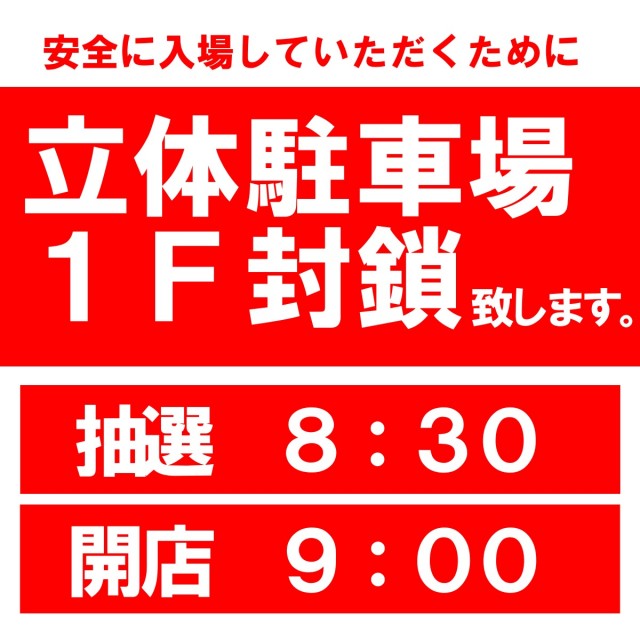 当日8:40に立体駐車場エレベーターホール前にて抽選を行います。8:50より整列開始。 |